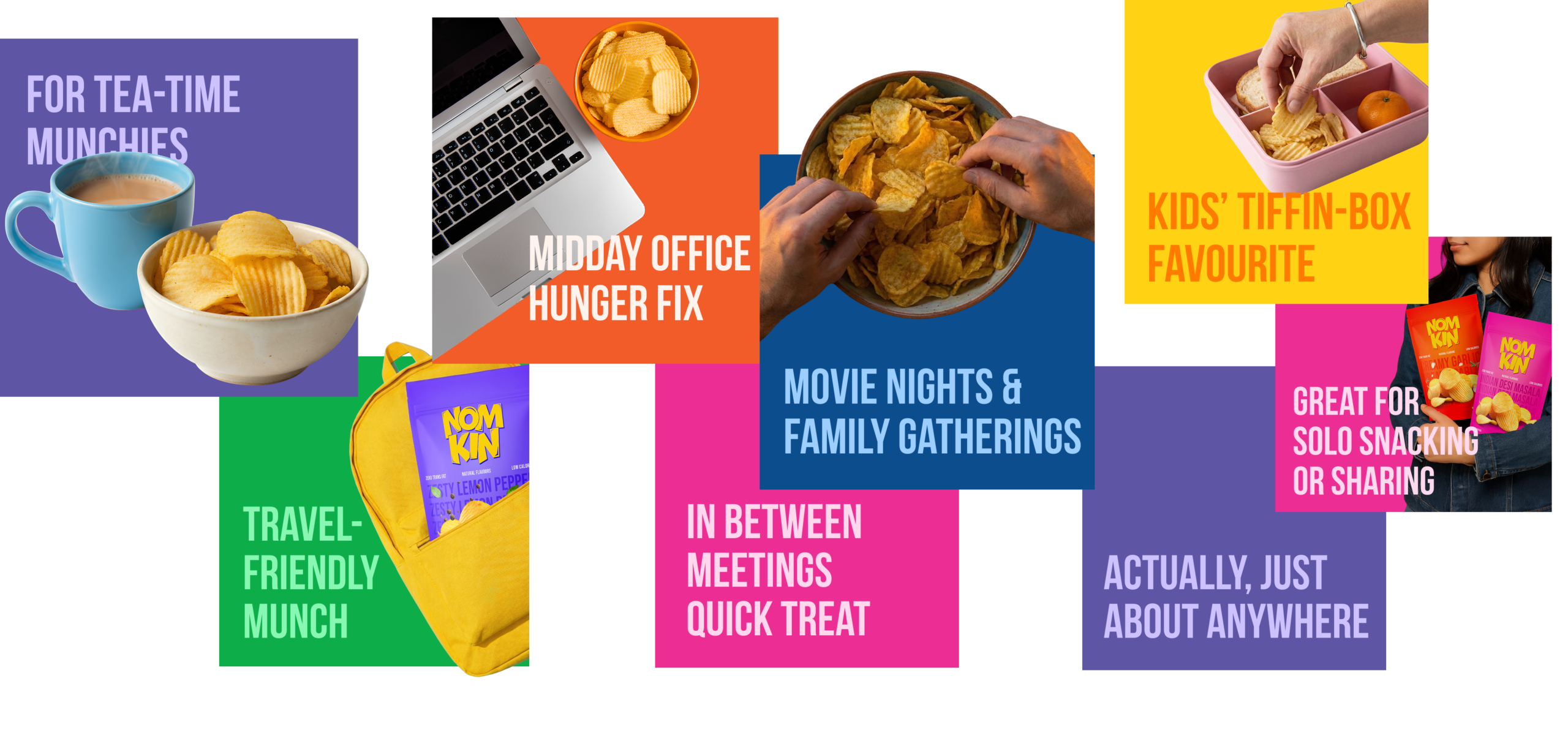 Nomkin fits perfectly into every moment! Daily routine? Late-night cravings? Binge-watching sessions? Spontaneous munchies? Absolutely. No special occasion needed because every moment is better with NomKin. Let’s get snacking!